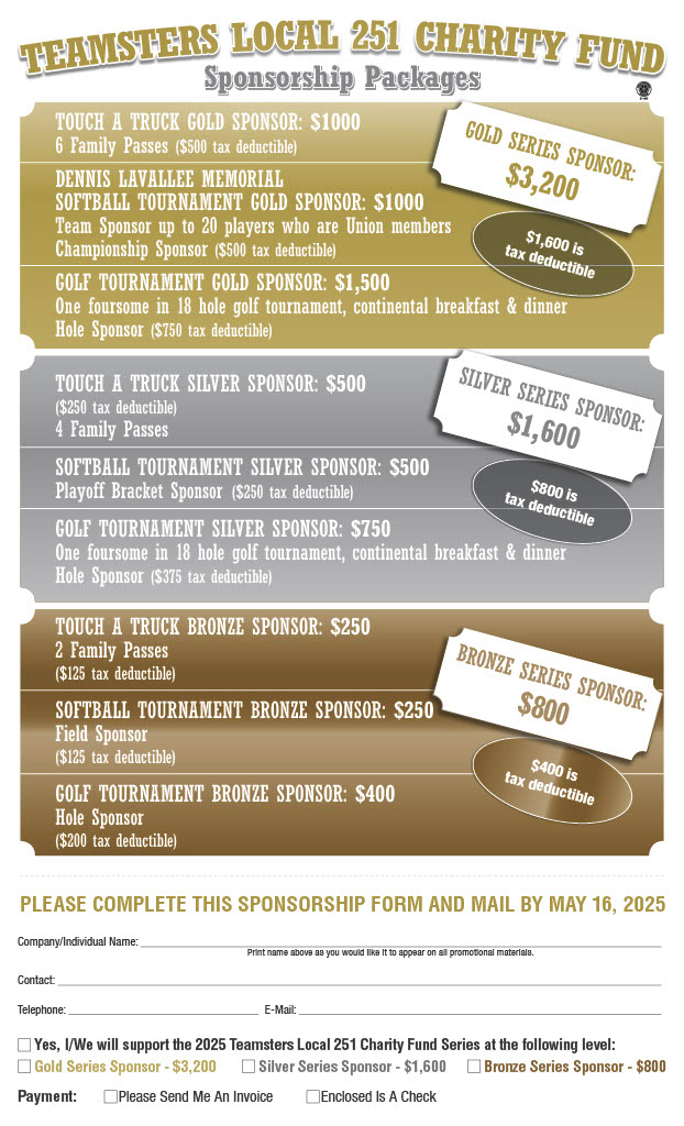 Our Event Series Sponsorship packages are available for any groups or organizations who would like to sponsor any or all of the three Teamsters Local 251 Charity Fund events. Our Gold package is $3200, Silver is $1600, and Bronze is $800. If you want more information about the events, the Series packet with three event flyers are available 251 Charity Fund Sponsor Packet 2025